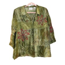 Alfred Dunner 100% Silk Beaded Embellished Crinkle Button Down Shirt Boho Fairy
